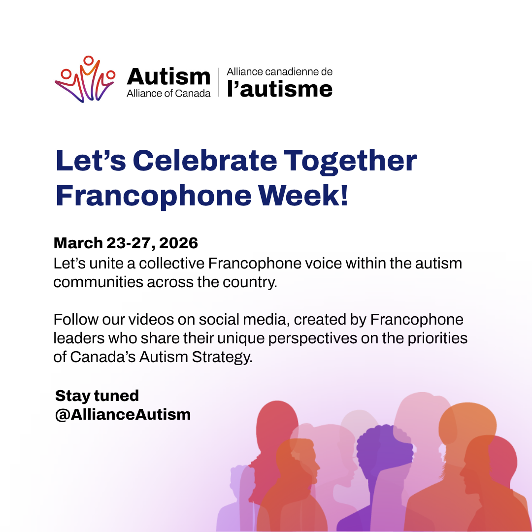 Autism Alliance of Canada invites you to celebrate the second edition of Semaine de la francophonie (Francophonie Week) taking place online across Canada on March 23-27, 2026. Join us as we amplify the collective Francophone, Francophile and bilingual autism communities from coast to coast.