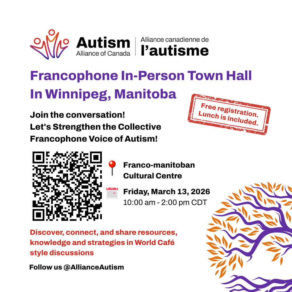 Stay tuned for upcoming in-person and virtual Town Hall announcements . Don’t miss your chance. Join the conversation to bring about a Francophone collective voice of Autism and strengthen community capacity across Canada!