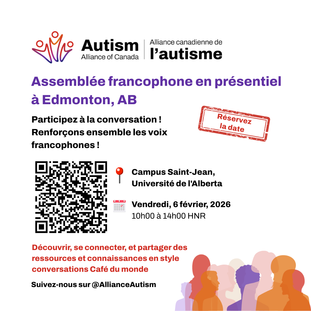 Restez à l’affût des dates et des détails sur d’autres Assemblées en présentiel et en ligne partout au Canada ! Ne manquez pas l’occasion. Participez à la conversation pour unir les voix francophones de l’autisme et renforcer la capacité communautaire à travers le Canada !