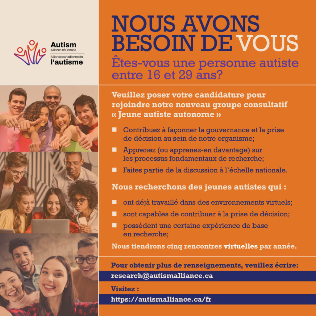Pour obtenir davantage d’information, veuillez écrire à : research@autismalliance.ca