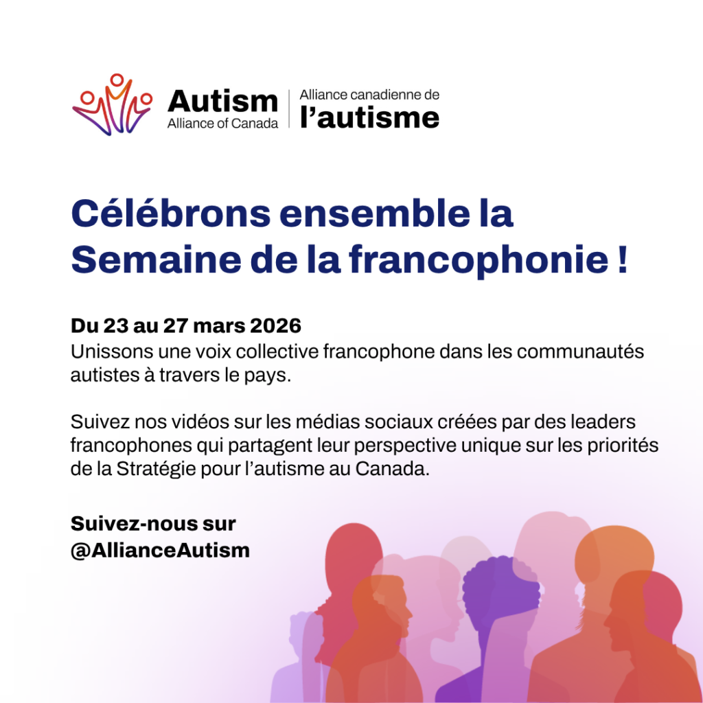Du 23 au 27 mars 2026, suivez l’Alliance de l’autisme du Canada sur les médias sociaux @AllianceAutism alors que nous soulignons et célébrons les participants des assemblées francophones au sein des communautés autistes à travers le pays. La Semaine de la francophonie fait partie d’une célébration mondiale de la culture francophone qui se déroule tout au long du mois de mars.