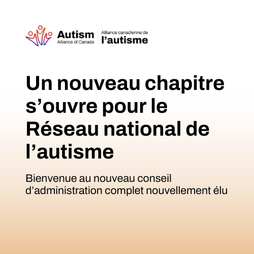 L’Alliance canadienne de l’autisme félicite le Réseau national de l’autisme sur l’élection de son premier conseil d’administration complet, une étape importante qui marque l’achèvement réussi de la phase de démarrage du réseau et le début d’un nouveau chapitre vers l’indépendance.