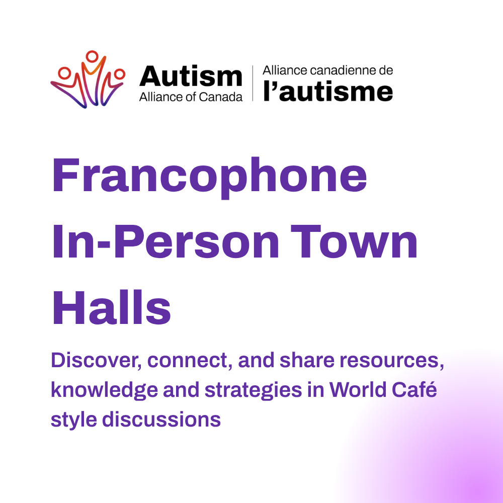 Autism Alliance of Canada invites you to participate in our Town Halls from September 2025 through the summer of 2026. To advance Canada's Autism Strategy, join the conversation to strengthen the Francophone collective voice of Autism across Canada. Look for dates being hosted online or in-person throughout the year! “Click read more”